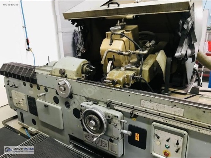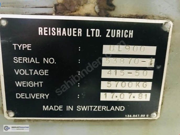 REİSHAUER WORM GRINDING UL900 workpiece diameter 250 mm threading length 900 mm thread pitch 100 mm total power requirement 12 kW weight of the machine ca. 6500 kg dimensions of the machine ca. m R E I S H A U E R (Switzerland) Universal Thread- Worm-and Ballscrewspindle Grinding Machine Model UL 900 Year 1981 grinding length 900 mm Max. workpiece clamping length 1.200/1.375 mm Workpiece Ø / thread Ø, min./max. 10 – 250 mm Length adjustment of workhead on table 210 mm Max. weight of workpiece approx. 200 kg Workspindle bore 45 mm Lead range for single-rib wheels 0.3 – 100 mm Max. profile 10 module Max. lead angle +/- 40 ° Grinding wheel dimensions, Ø x width 350 x 20/40 mm Relief grinding size 0.01 – 8 mm Presettable number of flutes 2 – 10, 12, 14 and 16 27 workpiece speeds 0.4 – 160 rpm Stepless adjustable grinding wheel speeds 72 – 2.500 rpm Spindle drive, approx. 6 kW Total electric load approx.. 15 kW - 400 V - 50 Hz Weight approx. 7,500 kg